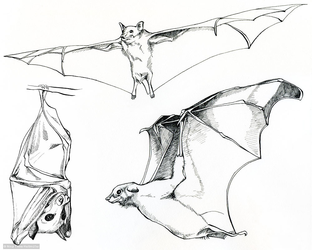 Diese herrlichen Tierchen ernähren sich gerne von Bananen, die sie mir aus der Hand fressen...!\Hier sieht man eine Zusammenstellung von Federzeichnungen, die im Rahmen einer Dissertation (Biologie) über den Rousettus Aegyptiacus entstanden sind.Der links unten hängende ist aber ein Tierchen namens "Dobsonia moluccensis" und ist quasi nur zu Besuch.