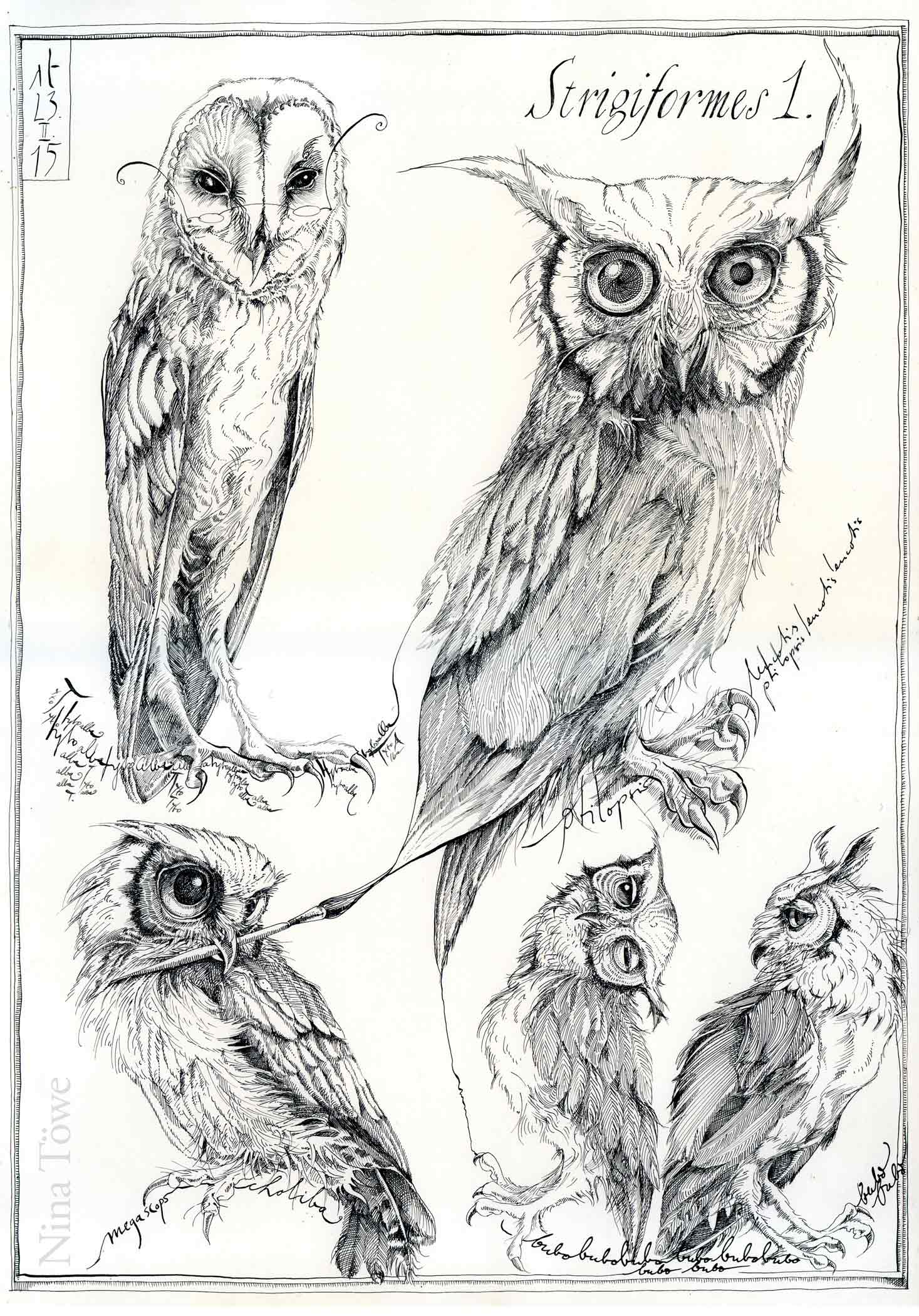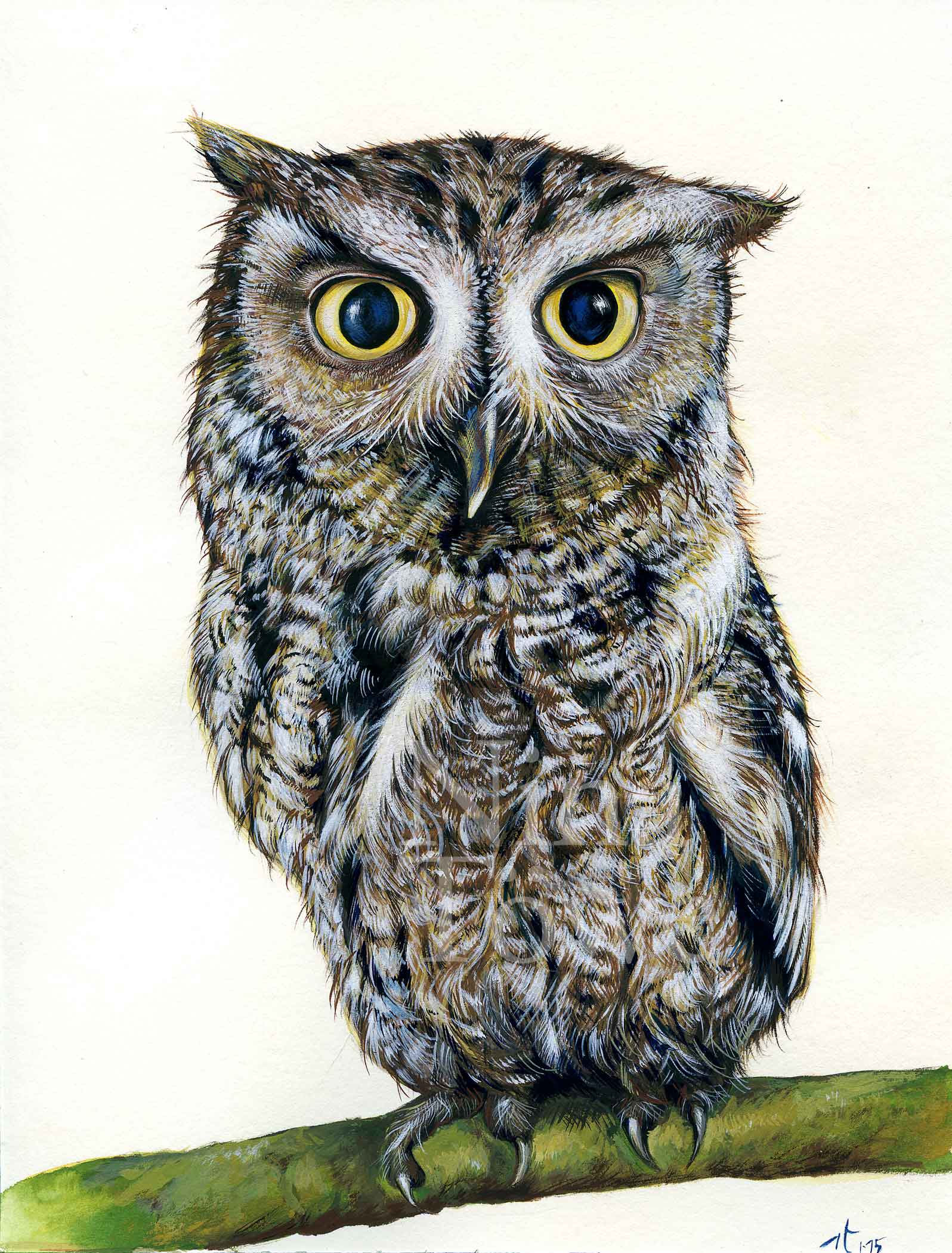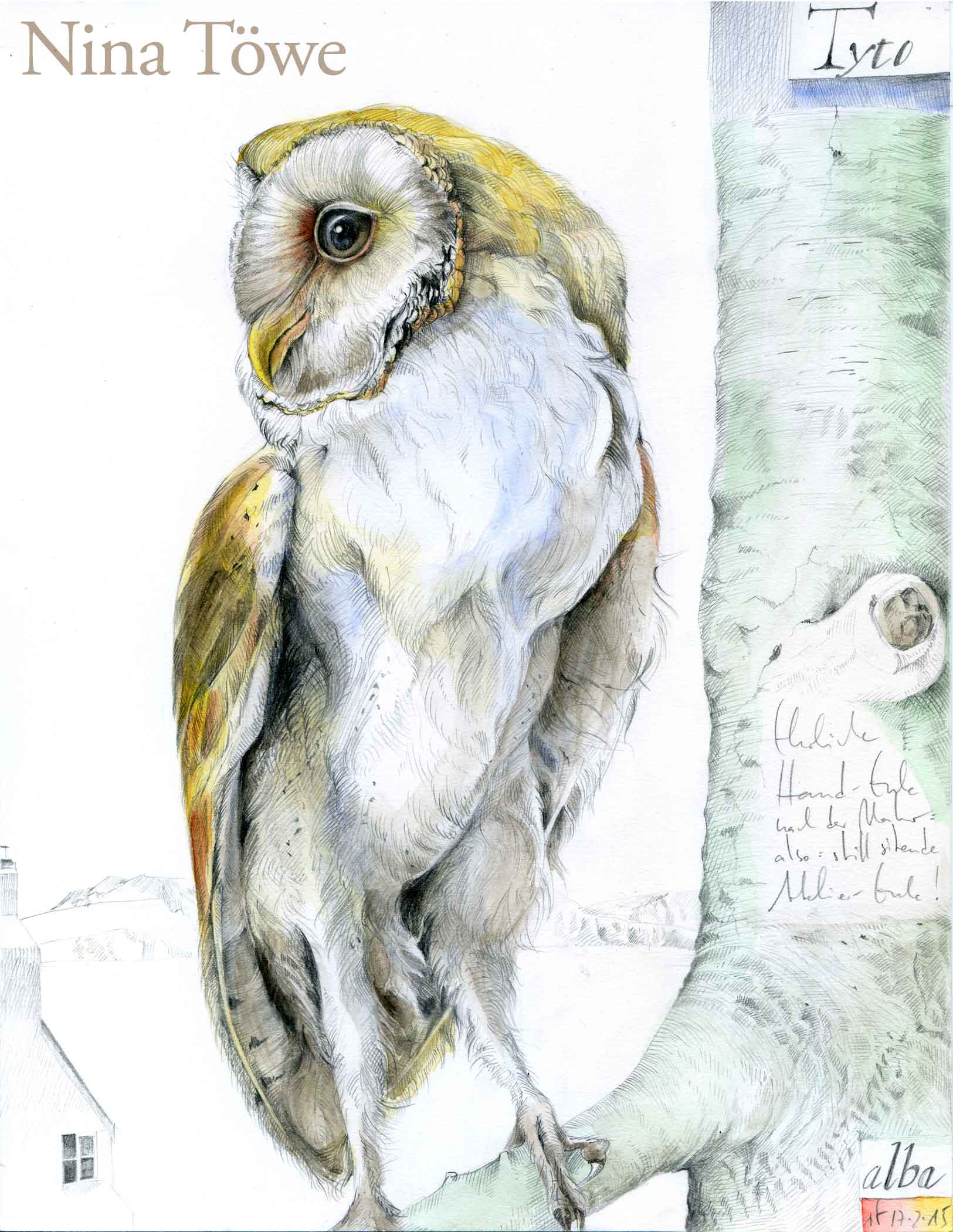Die Erzzauberin in ihrem alten Schloss....tagsüber Nachteule, abends Mensch.Illustration zu "Jorinde und Joringel" der Brüder Grimm. Aquarell und Gouache